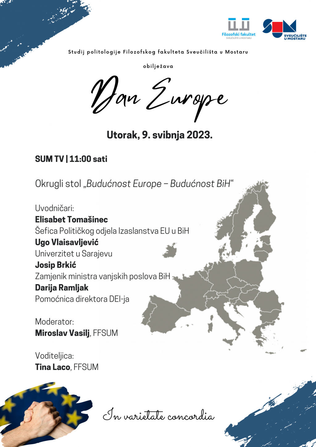 MOSTAR, 8. svibnja (FENA) - Studij politologije Filozofskog fakulteta Sveučilišta u Mostaru u sklopu Tjedna Europe obilježava Dan Europe 9. svibnja, u utorak središnjim događajem – okruglim stolom o temi "Budućnost Europe – Budućnost BiH" koji će se održatti na Televiziji Sveučilišta u Mostaru (SUM TV) – Kampusu SUM-a u 11.00 sati.