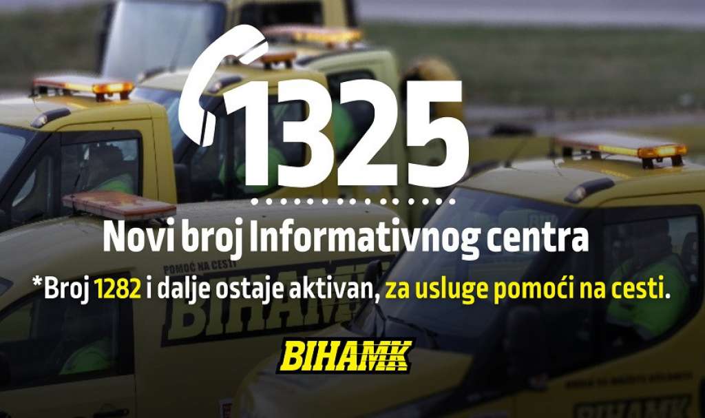 SARAJEVO, 10. maja (FENA) - Umjesto dosadašnjeg telefonskog broja za upite o stanju na cestama – 1282, opcija 3, uveden je novi, izmijenjeni pozivni broj Informativnog centra BIHAMK-a: 1325 za informacije o stanju na cestama.