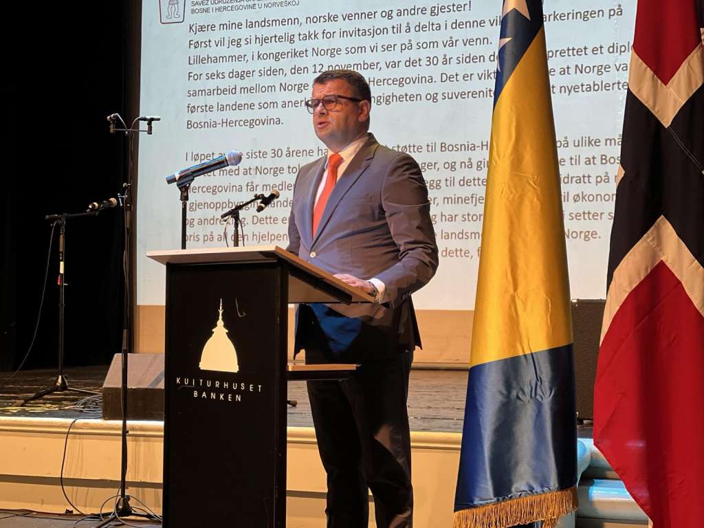 SARAJEVO, 19. novembra (FENA) - Ministar za ljudska prava i izbjeglice Bosne i Hercegovine Sevlid Hurtić, učestvovao je sinoć u Lillehammeru, Kraljevina Norveška, na obilježavanju 30 godina od uspostavljanja diplomatskih odnosa između Bosne i Hercegovine i Norveške, te 30 godina od dolaska bosanskohercegovačkih državljana u ovu zemlju.