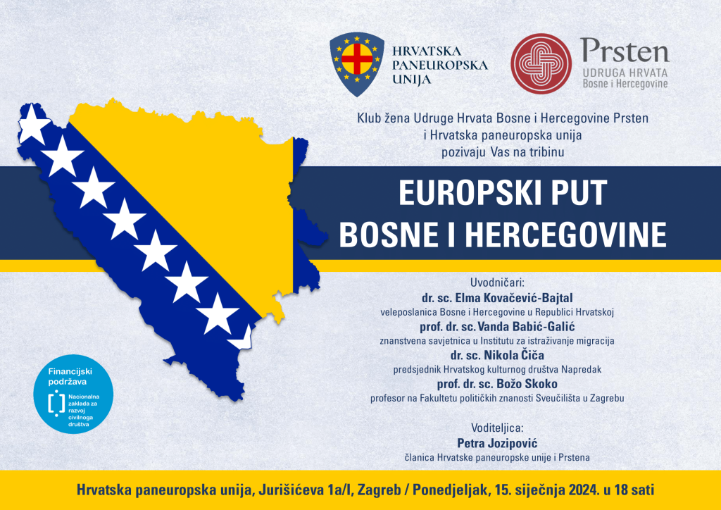ZAGREB, 10 siječnja (FENA) - U Zagrebu će se u ponedjeljak, 15. siječnja, održati tribina „Europski put Bosne i Hercegovine”, a tribinu organiziraju Klub žena Udruge Hrvata Bosne i Hercegovine Prsten i Hrvatska paneuropska unija.