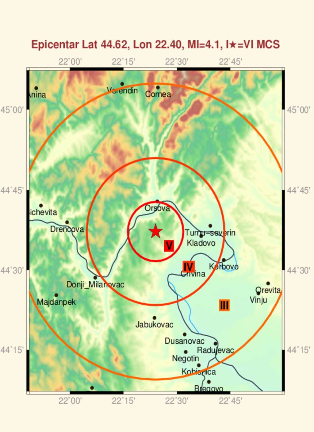 BEOGRAD, 30. travnja (FENA) - Potres jačine 4.1 stupanj prema Rictheru registriran je u utorak na području Kladova u Srbiji, priopćeno je jutros iz srbijanskog Republičkog seizmološkog zavoda.
