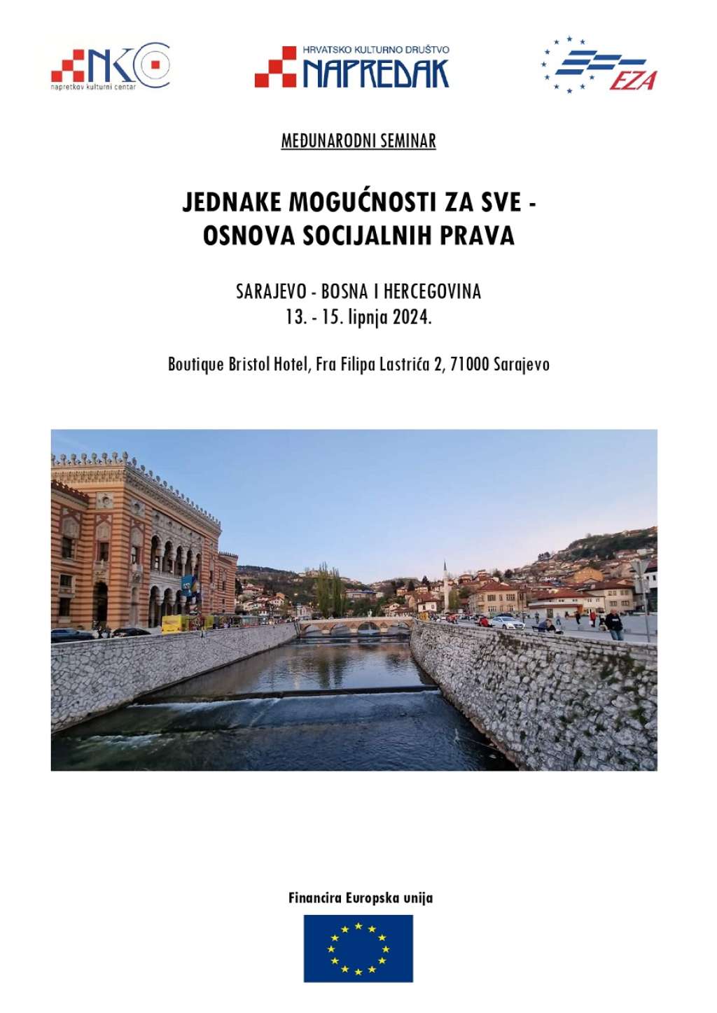 MOSTAR, 10. lipnja (FENA) - Međunarodni seminar "Jednake mogućnosti za sve-osnova socijalnih prava" održat će se od 13. do 15. lipnja u Sarajevu, a bavit će se razmjenom ideja, najboljih praksi i uspješnih mjera za rješavanje problema nezaposlenosti mladih i problema zapošljavanja starijih radnika i izbjeglica, najavili su iz HKD Napredak.