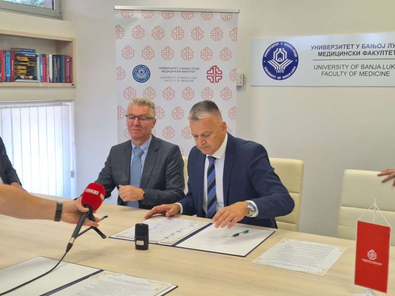 BANJA LUKA, 25. novembar (Fena) - Dekani medicinskih fakulteta u Banjoj Luci i Zagrebu Ranko Škrbić i Slavo Orešković potpisali su danas Sporazum o saradnji ta dva fakulteta.