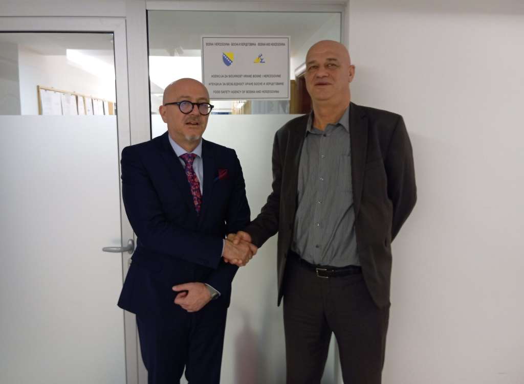 MOSTAR, 29. siječnja (FENA) - Kako bi se osigurala visoka razina zaštite zdravlja i interesa potrošača u Bosni i Hercegovini, potrebno je intenzivirati proces usklađivanja propisa o hrani sa zakonodavstvom Europske unije i povećati broj uzoraka i laboratorijskih analiza u okviru službenih kontrola hrane, zaključeno je, između ostalog, na sastanku dr.sc. Sanina Tankovića, ravnatelja Agencije za sigurnost hrane Bosne i Hercegovine i dr.sc. Midhata Glavića, ravnatelja Federalnog zavoda za poljoprivredu održanom u srijedu u Mostaru.