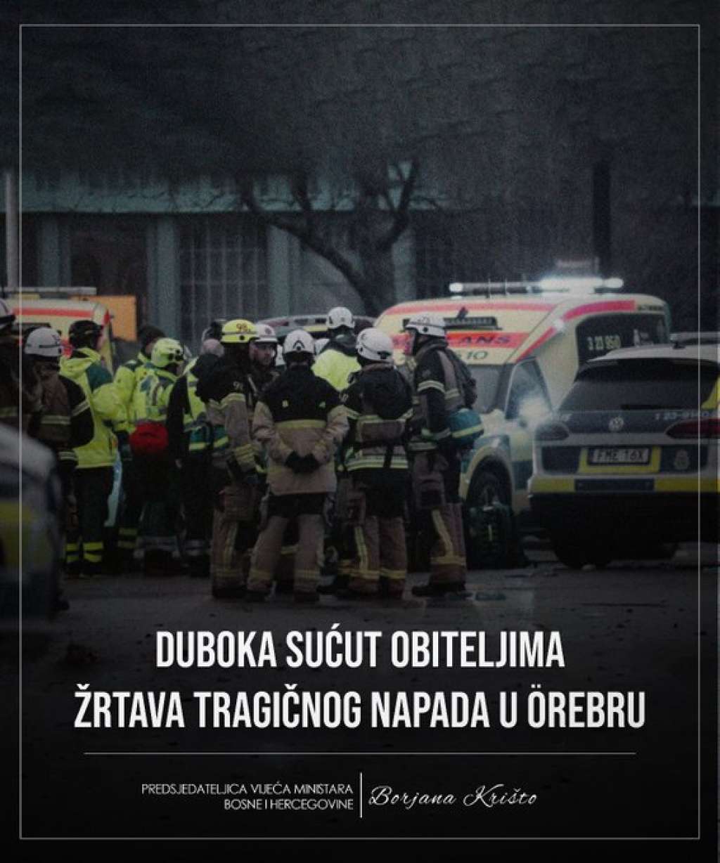 SARAJEVO, 6. februara (FENA) - Predsjedavajuća Vijeća ministara Bosne i Hercegovine Borjana Krišto objavila je na platformi X da izražava svoje duboku saučešće porodicima žrtava tragičnog napada u švedskom Orebru.