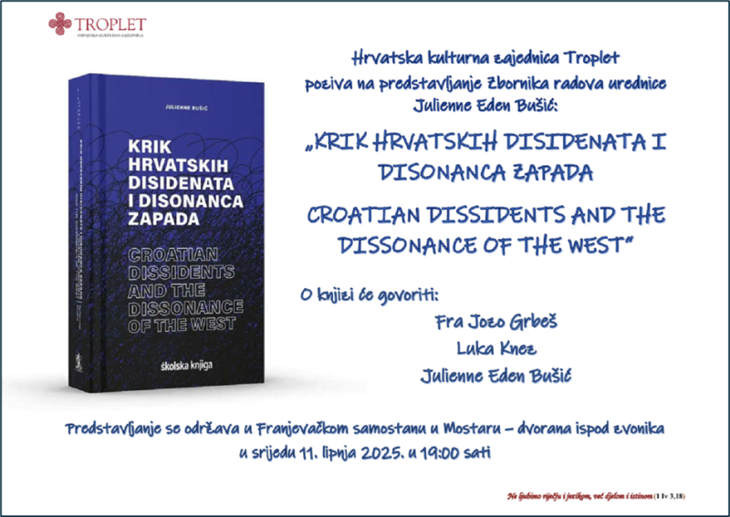 GRUDE, 10. veljače (FENA) – Predstavljanje knjige ''Krik hrvatskih disidenata i disonanca Zapada/Croatian Dissidents and the Dissonance of the West'', Julienne Bušić upriličit će se u četvrtak, 13. veljače u 19 sati u knjižnici Osnovne škole ''Ruđer Bošković'' u Grudama.