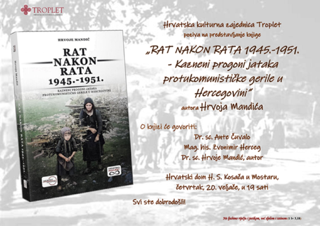 MOSTAR, 18. veljače (FENA) - Predstavljanje knjige "Rat nakon rata 1945.-1951. – Kazneni progoni jataka protukomunističke gerile u Hercegovini", autora dr. sc. Hrvoja Mandića, bit će upriličeno 20. veljače u Galeriji kraljice Katarine Kosače u Mostaru s početkom u 19 sati.