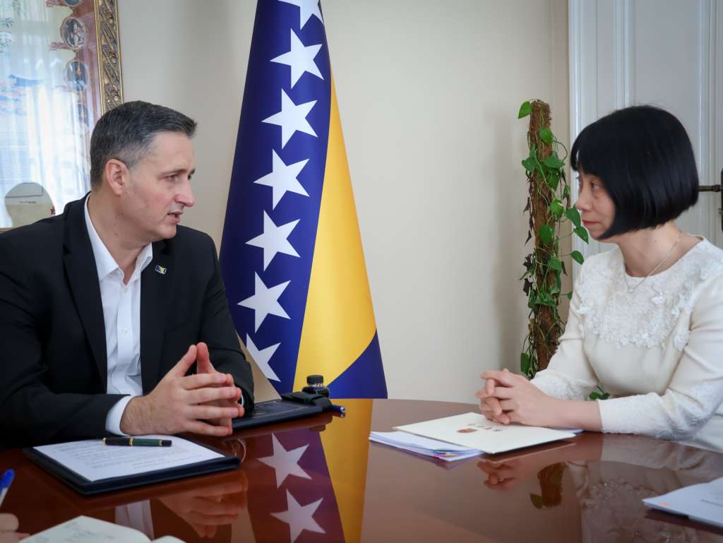 SARAJEVO, 12. marta (FENA) - Član Predsjedništva BiH Denis Bećirović primio je danas u nastupnu posjetu ambasadoricu Narodne Republike Kine u Bosni i Hercegovini Li Fan kojoj je poželio dobrodošlicu i uspješan mandat, s ciljem daljnjeg jačanja bilateralnih odnosa dvije države.