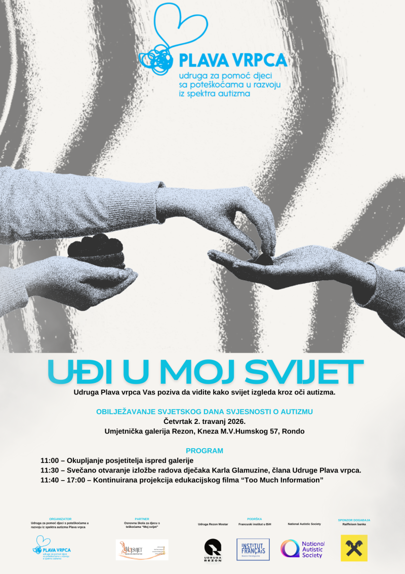MOSTAR, 25. ožujka (FENA) – Udruga za pomoć djeci s poteškoćama u razvoju iz spektra autizma "Plava vrpca" po prvi put u Mostaru organizira Mjesec podizanja svijesti o autizmu, pridružujući se globalnoj kampanji Light It Up Blue, koju je 2010. godine pokrenula organizacija Autism Speaks.