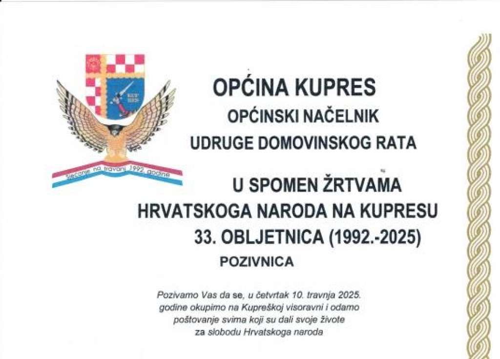 KUPRES, 31. ožujka (FENA) – U organizaciji Općine Kupres i braniteljskih udruga proisteklih iz Domovinskog rata, 9. i 10. travnja obilježit će se 33. obljetnica stradanja hrvatskog naroda na Kupreškoj visoravni pod nazivom "U spomen žrtvama hrvatskog naroda na Kupresu (1992.-2025.)".