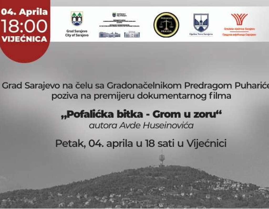 SARAJEVO, 1. aprila (FENA) - Grad Sarajevo na čelu sa gradonačelnikom Predragom Puharićem domaćin je premijere dokumentarnog filma „Pofalićka bitka - Grom u zoru“ autora Avde Huseinovića koja će biti održana u petak, 4. aprila u 18 sati u Vijećnici.