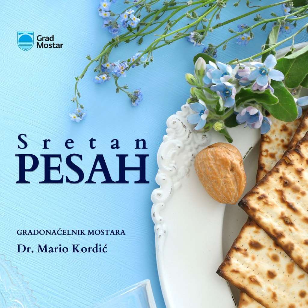MOSTAR, 12. travnja (FENA) - U povodu najvećeg židovskog blagdana Pesaha, kojim se židovski narod spominje čudesnog Božjeg zahvata izbavljenja iz egipatskog ropstva, mostarski gradonačelnik Mario Kordić u subotu je svim građanima Mostara židovske vjeroispovijesti uputio čestitku.