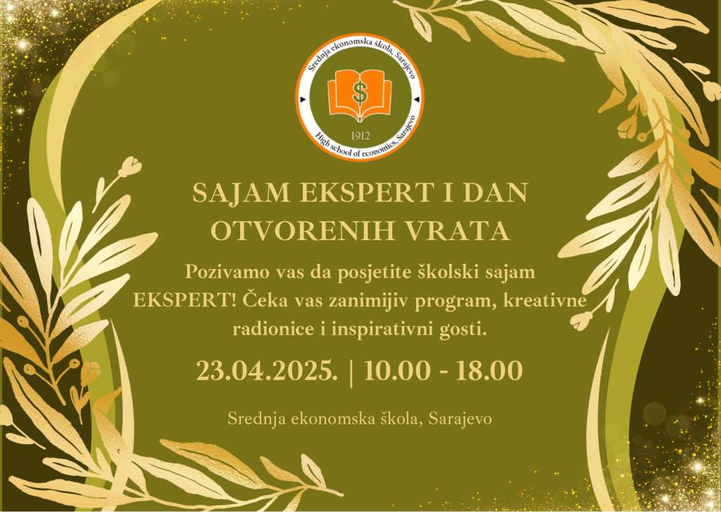 SARAJEVO, 22. aprila (FENA) – Sajam EKSPERT koji će biti održan 23. aprila ove godine u prostorijama JU Srednja ekonomska škola Sarajevo, okupit će učenike, ali i privrednike koji će motivirati učenike da kreiraju vlastite poduzetničke ideje.