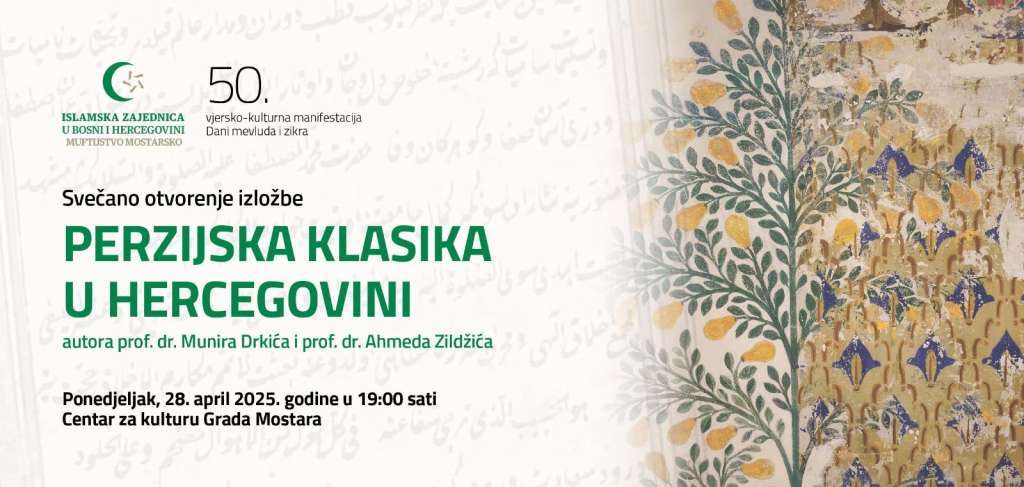 MOSTAR, 28. aprila (FENA) - U okviru programa manifestacije "Dani mevluda i zikra" večeras će u Mostara biti otvorena izložba "Perzijska klasika Hercegovini- Od Hasana Zijaije Mostarca do Alekse Šantića“ autora prof. dr. Munira Drkića i prof. dr. Ahmeda Zildžića.