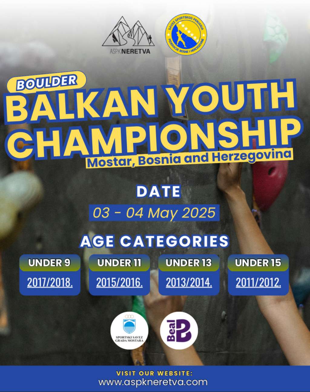 MOSTAR, 28. travnja (FENA) - Mostar će 3. i 4. svibnja 2025. godine biti domaćin Balkanskog prvenstva u sportskom penjanju za mlađe kategorije – disciplina Boulder (Balkan Youth Under 15 Championship in Boulder).