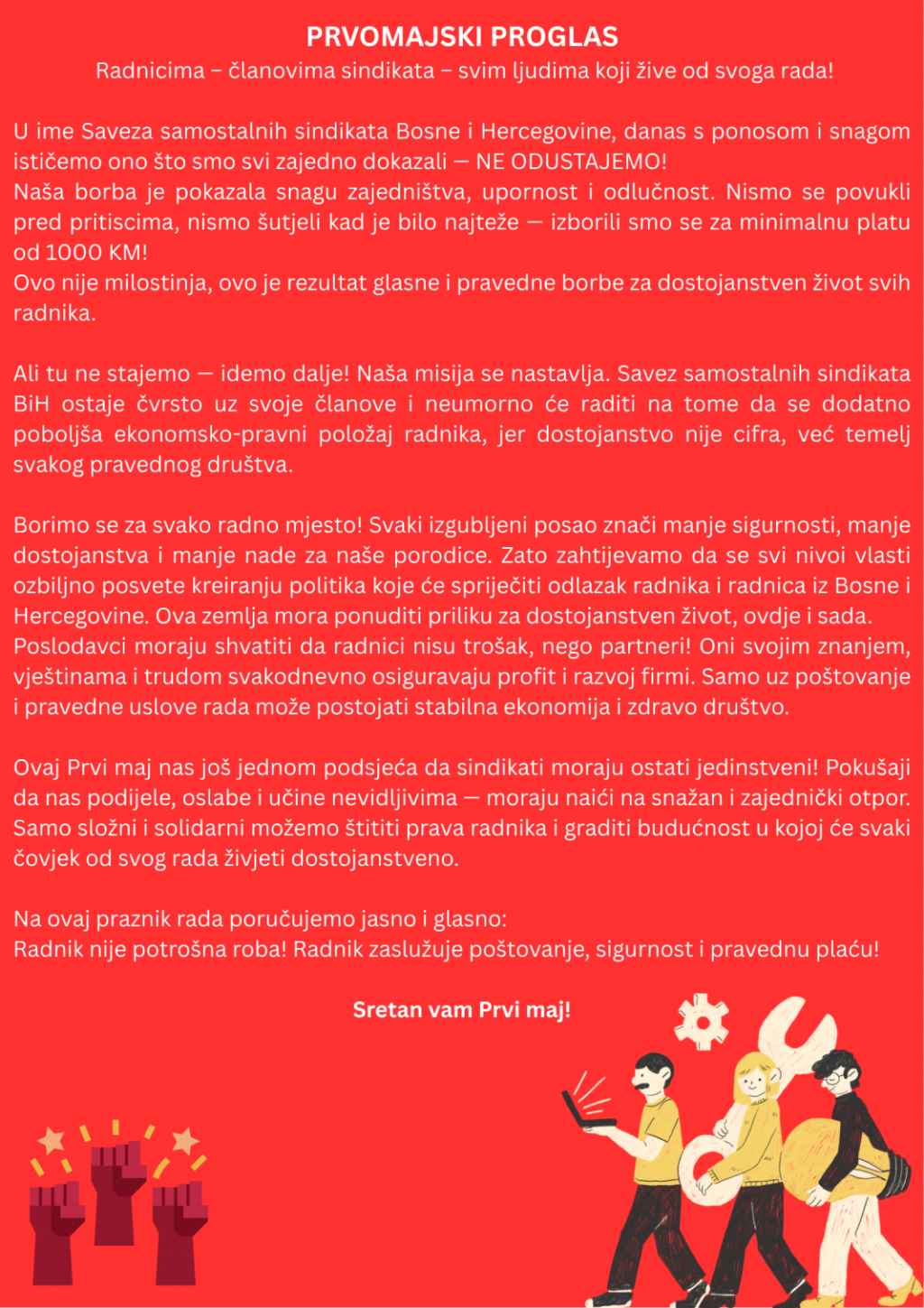 SARAJEVO, 30. aprila (FENA) - U ime Saveza samostalnih sindikata Bosne i Hercegovine, danas s ponosom i snagom ističemo ono što smo svi zajedno dokazali - ne odustajemo - navedeno je u Prvomajskom proglasu Saveza samostalnih sindikata BiH.