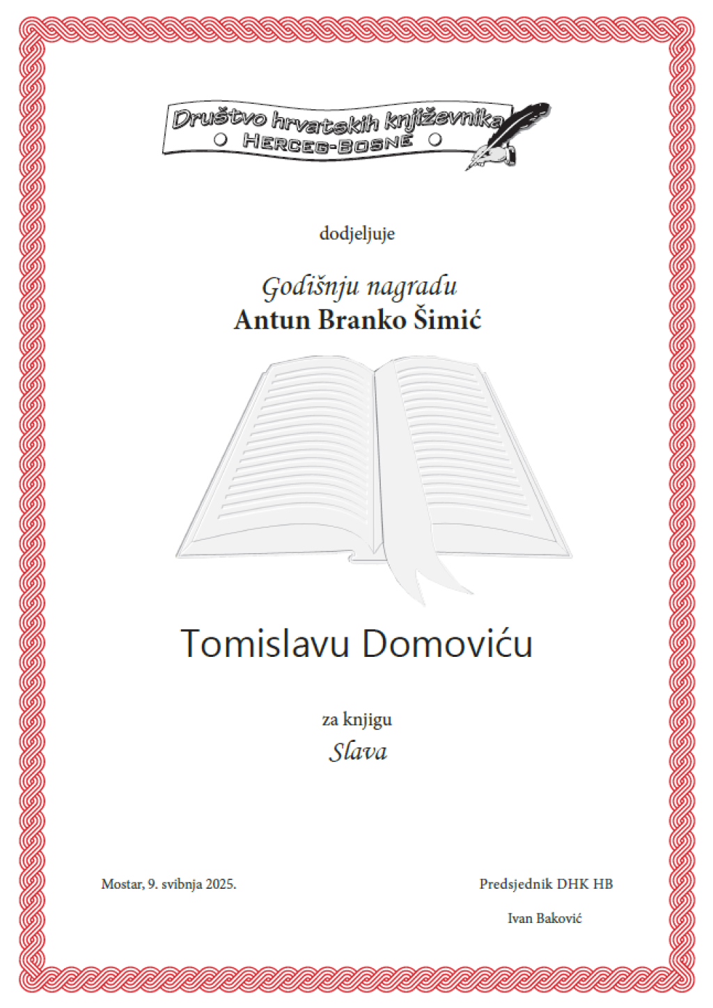 DRINOVCI, 9. svibnja (FENA) – Pjesnik Tomislav Domović dobitnik je Godišnje nagrade Društva hrvatskih književnika Herceg Bosne “Antun Branko Šimić” za zbirku poezije'' Slava'', koja je objavljena 2024. godine u izdanju zagrebačkog Vjetrokaza.