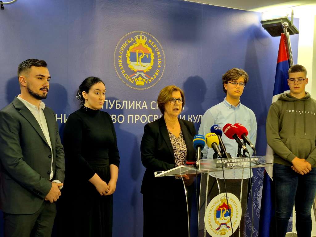 BANJA LUKA, 13. maja (FENA) - Ministar prosvjete i kulture Republike Srpske Željka Stojčić zajedno sa direktoricom Republičkog pedagoškog zavoda Slađanom Tanasić razgovarala je danas sa učenicima srednjih škola iz RS u pratnji nastavnika, a koji su se plasirali na prestižna međunarodna tamičenja iz matematike i fizike.
