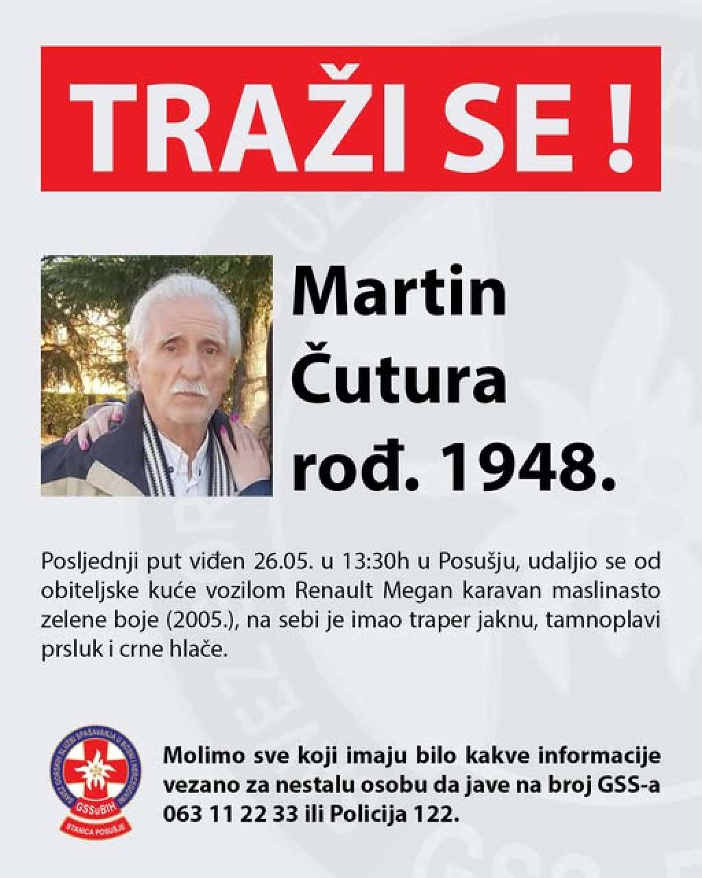 POSUŠJE, 27. svibnja (FENA) - Hrvatska gorska služba spašavanja (HGSS) Posušje od sinoć intenzivno traži nestalog Martina Čuturu, rođenog 1948. godine, na području Općine Posušje.