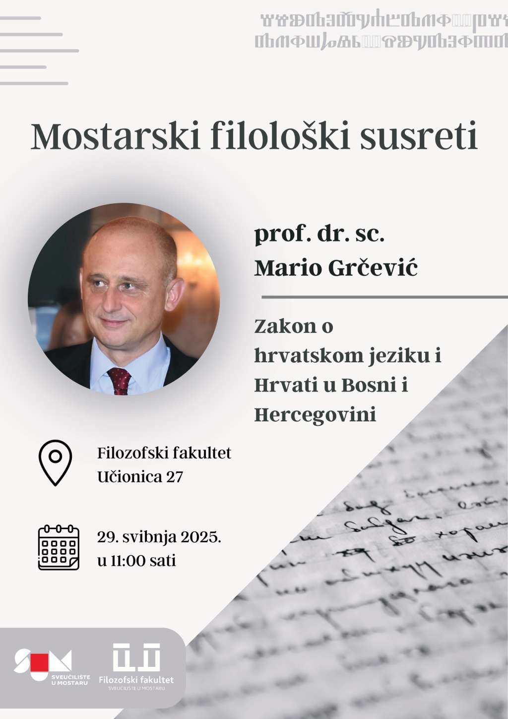 MOSTAR, 28. svibnja (FENA) - Predavanje na temu "Zakon o hrvatskom jeziku i Hrvati u Bosni i Hercegovini" profesora dr. sc. Marija Grčevića održat će se u četvrtak, 29. svibnja, s početkom u 11 sati na Filozofskom fakultetu Sveučilišta u Mostaru.