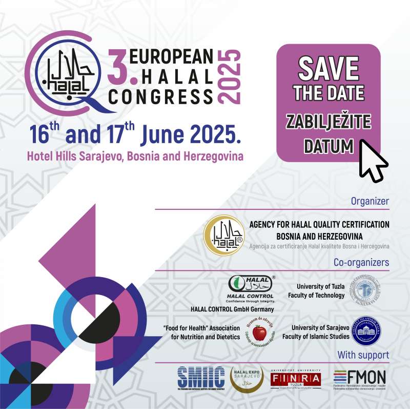 SARAJEVO, 2. juna (FENA) - Treće izdanje Evropskog halal kongresa bit će održano 16. i 17. juna u Sarajevu, u organizaciji Agencije za certificiranje halal kvalitete.