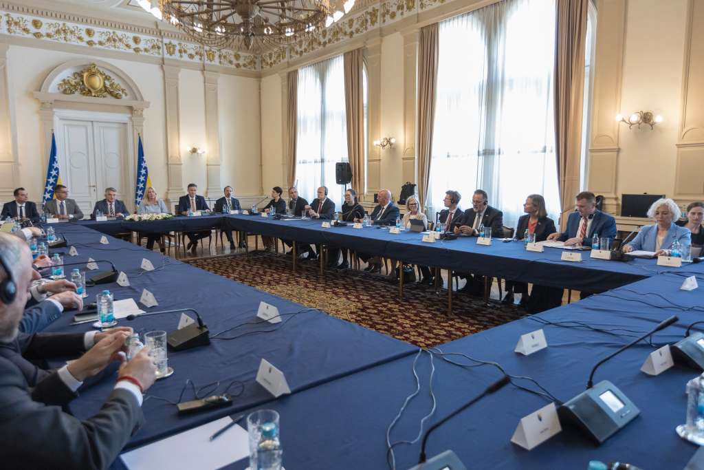 SARAJEVO, 3. juna (FENA) - Član Predsjedništva BiH Denis Bećirović razgovarao je s predstavnicima delegacije nordijskih i baltičkih zemalja (NB8) u sastavu: predsjednik Parlamenta Kraljevine Švedske (šef delegacije NB8) Andreas Norlén, predsjednik Parlamenta Republike Finske Jussi Halla-aho, predsjednica Parlamenta Republike Latvije Daiga Mieriņa, predsjednik Parlamenta Republike Litvanije Saulius Skvernelis, prvi zamjenik predsjednika Parlamenta Kraljevine Norveške Svein Harberg, prva zamjenica predsjednika Parlamenta Republike Island Bryndis Haraldsdóttir, drugi zamjenik predsjednika Parlamenta Republike Estonije Arvo Aller i treći zamjenik predsjednika Parlamenta Kraljevine Danske Karsten Hønge.