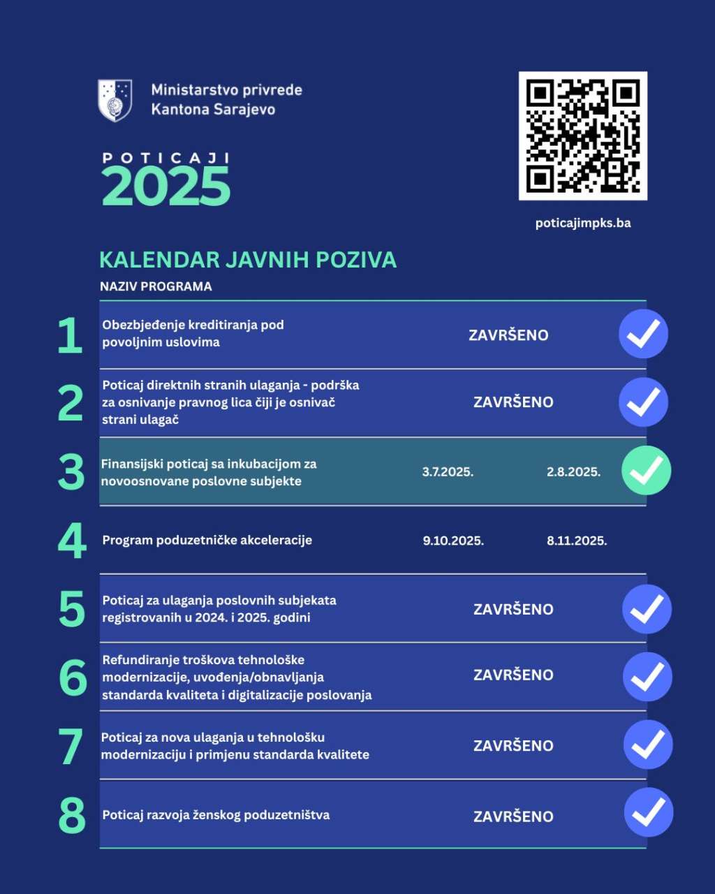 SARAJEVO, 3. jula (FENA) - Ministarstvo privrede Kantona Sarajevo objavilo je novi Javni poziv za dostavljanje prijava u svrhu dodjele finansijskog poticaja s inkubacijom za novoosnovane poslovne subjekte.