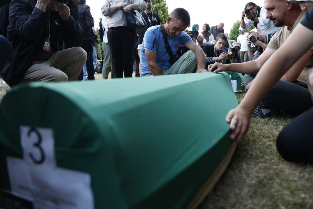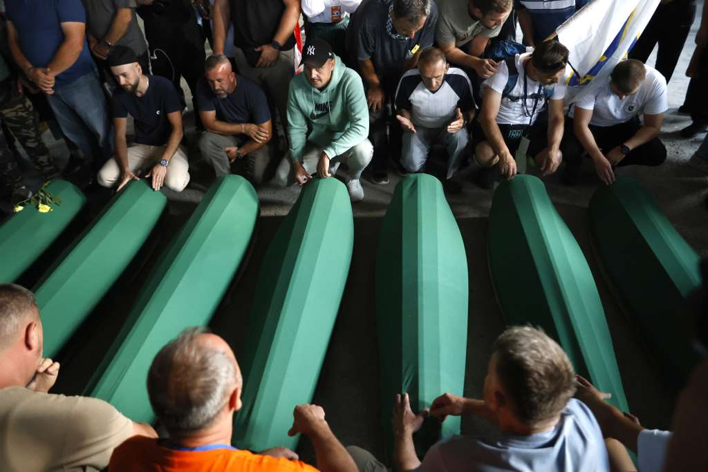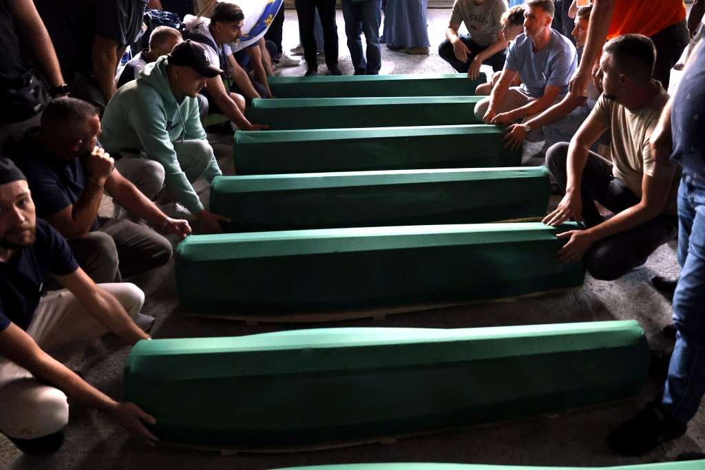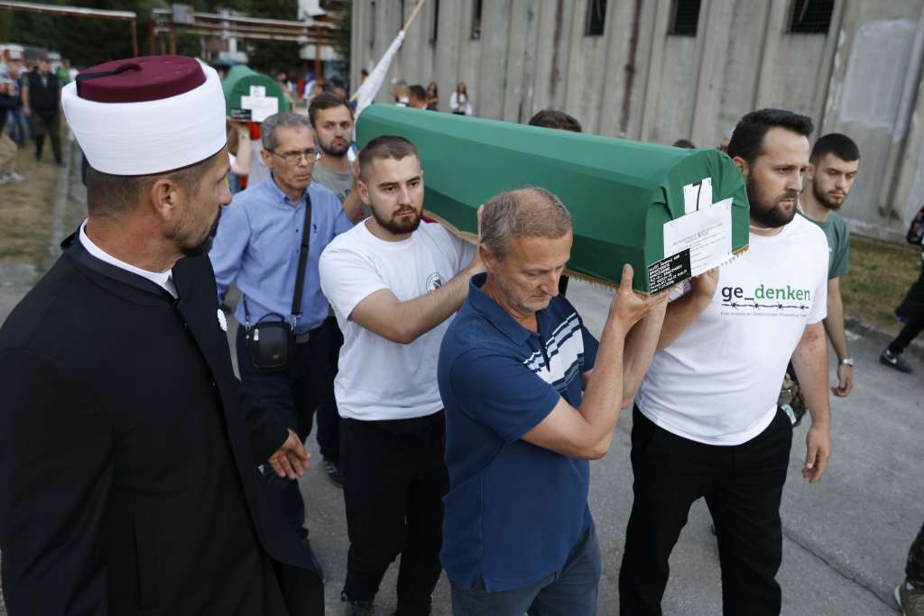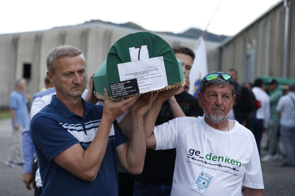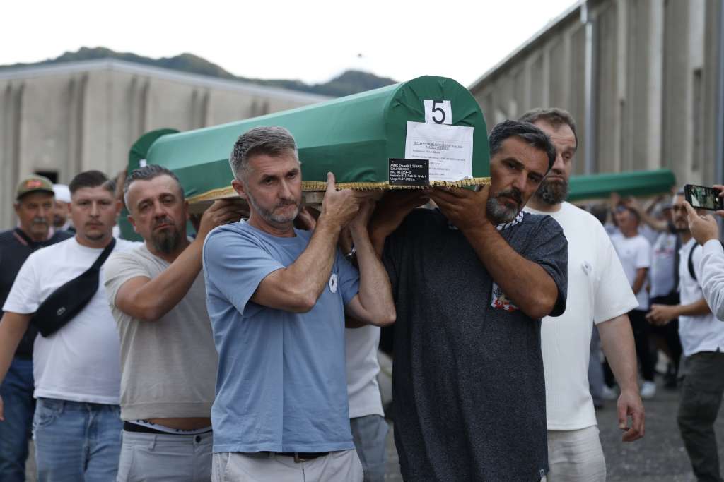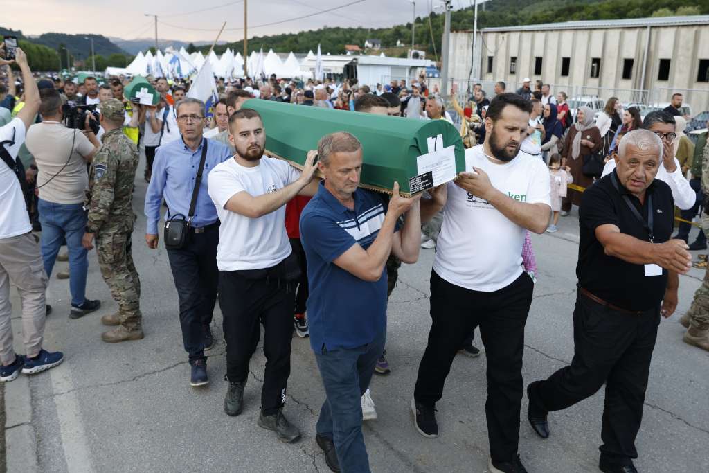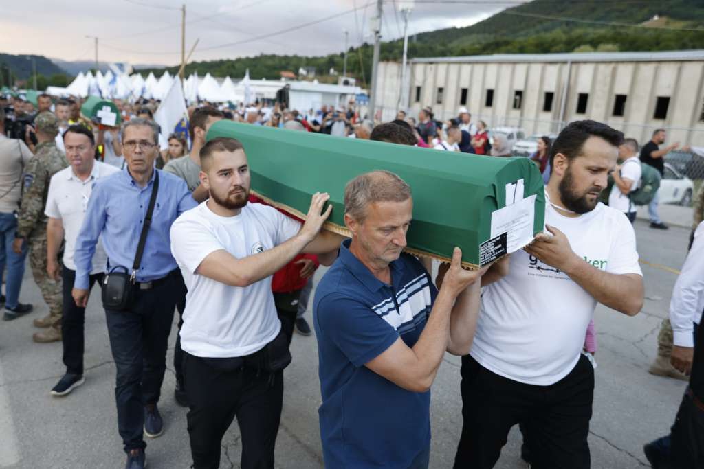 SREBRENICA, 10. jula (FENA) - Učesnici Marša mira i članovi porodica iznijeli su večeras tabute s posmrtnim ostacima žrtava genocida na musalu Memorijalnog centra Srebrenica-Potočari.