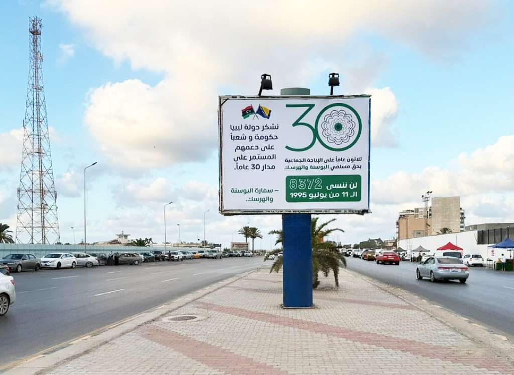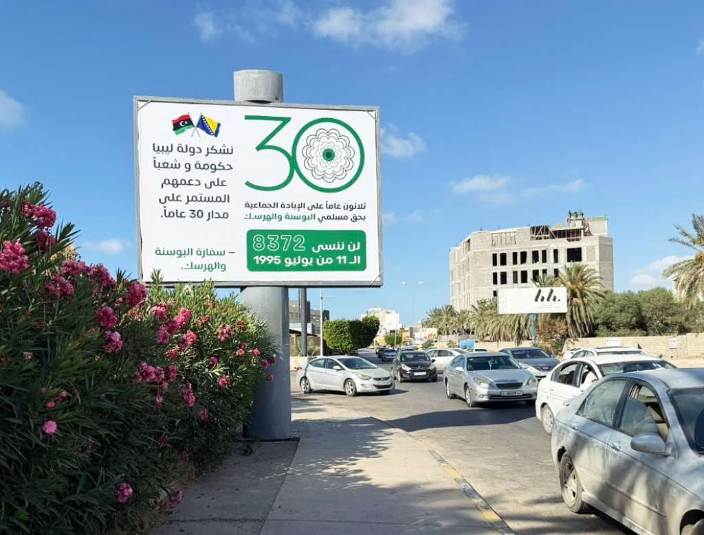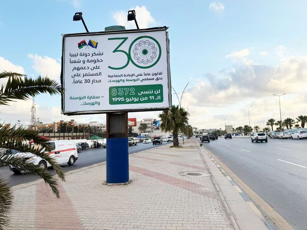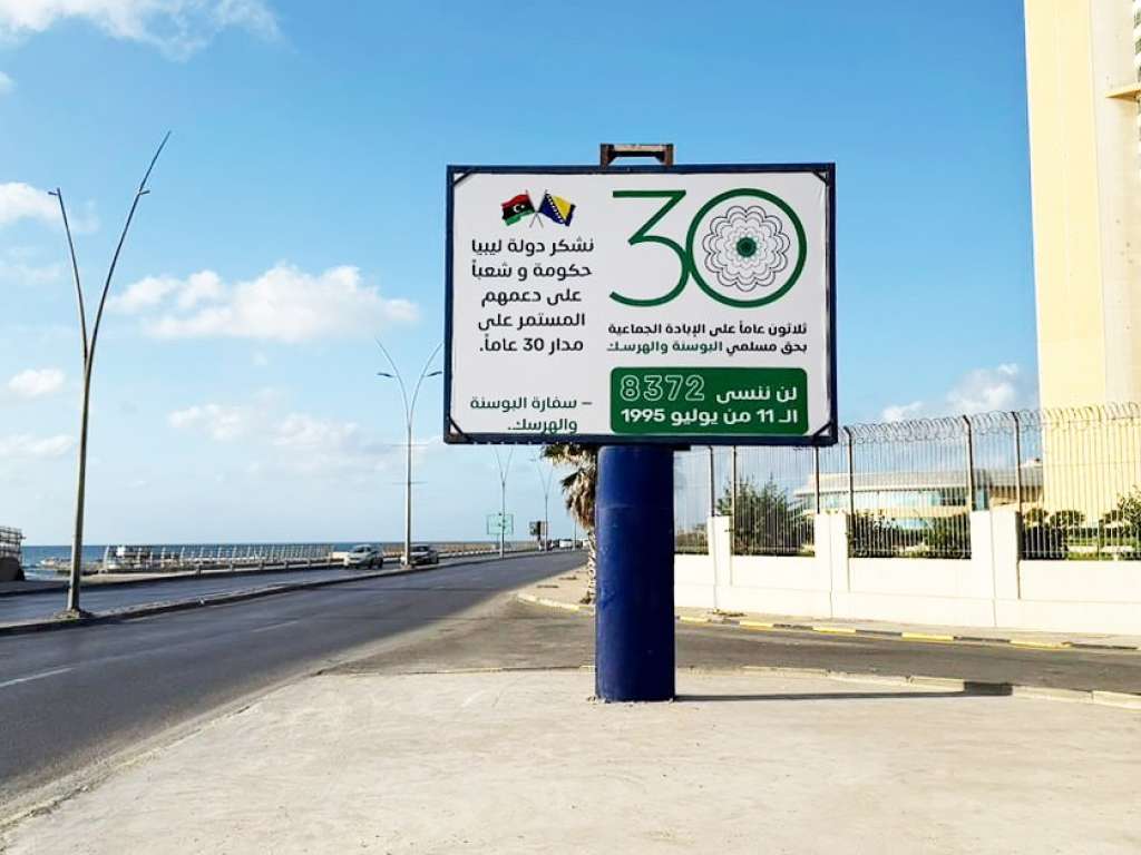 TRIPOLI, 10. jula (FENA) - Ambasada Bosne i Hercegovine u Tripoliju obilježila je 30. godišnjicu genocida u Srebrenici postavljanjem bilborda na glavnim saobraćajnicama glavnog grada Libije.