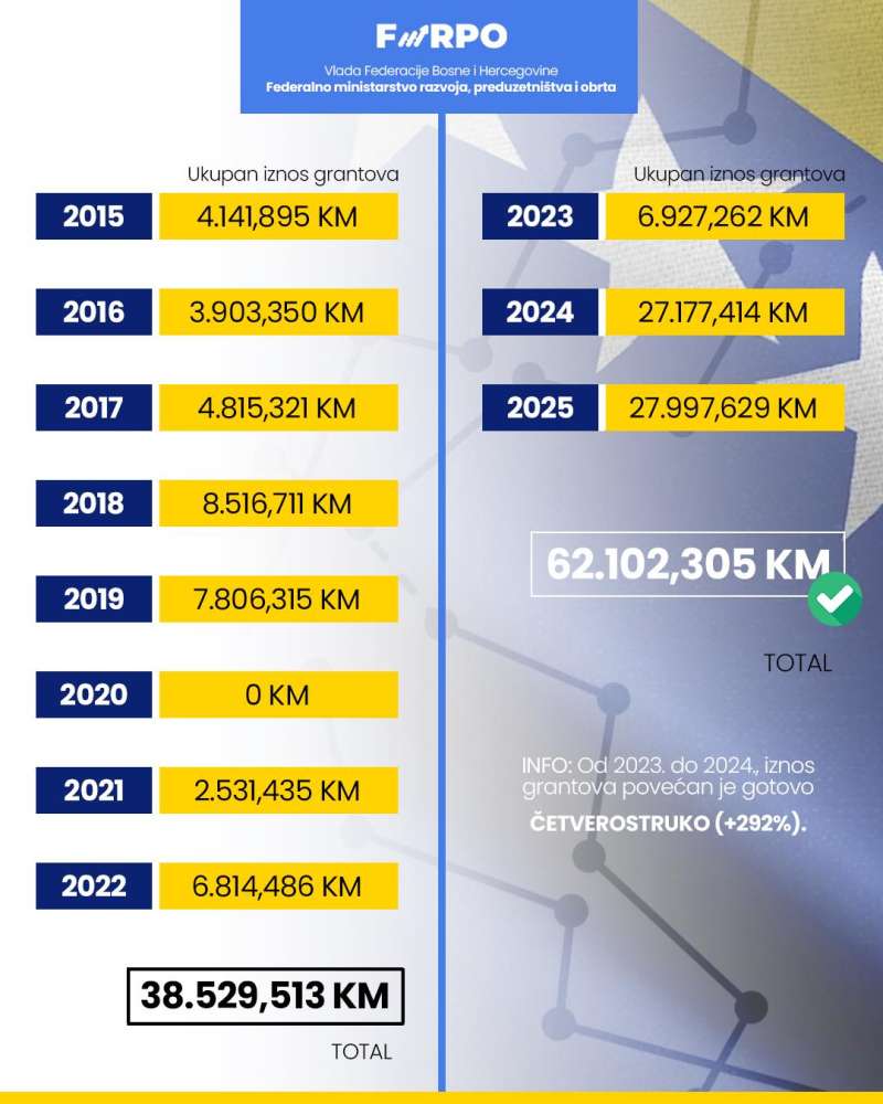 Potcrtano je da je od 2015. do 2022. za tu namjenu izdvojeno ukupno 38,5 miliona KM, a da je u periodu novog saziva Vlade FBiH - od 2023. do 2025. - izdvojen ukupno 62,1 milion KM.