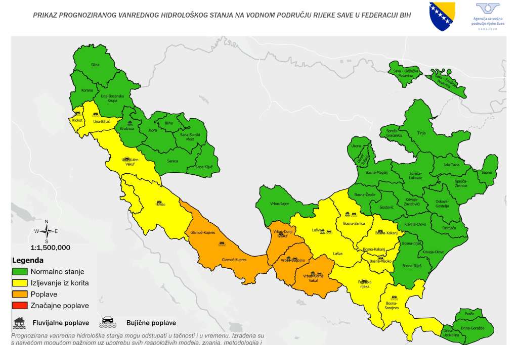 Obavještenje o prognozi vanrednog hidrološkog stanja odnosi se na područje Unsko-sanskog, Srednjobosanskog, Zeničko-dobojskog i Kantona Sarajevo.