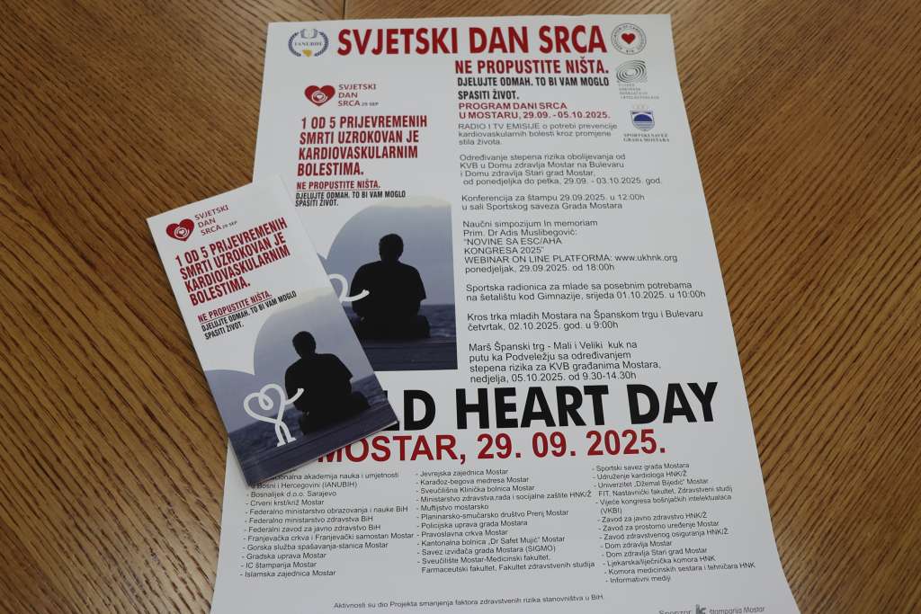 MOSTAR, 29. rujna (FENA) - Sportski savez Grada Mostara, u suradnji s Udruženjem kardiologa Hercegovačko-neretvanske županije (HNŽ), obilježava Svjetski dan srca nizom sportskih, rekreativnih i edukativnih aktivnosti.