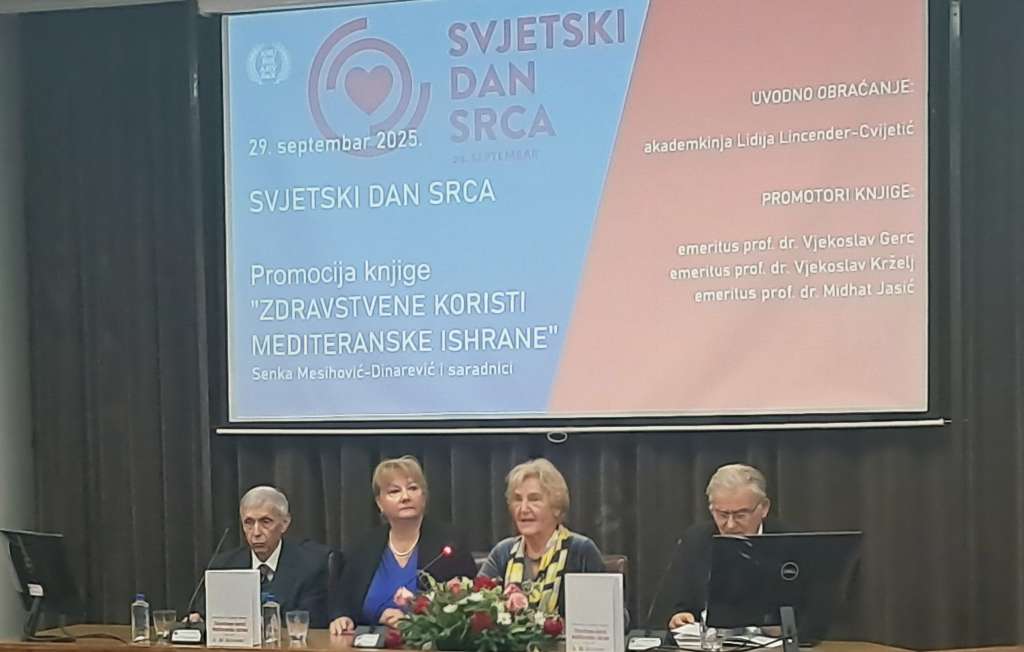 SARAJEVO, 29. septembra (FENA) - Akademija nauka i umjetnosti Bosne i Hercegovine (ANUBiH) obilježila je Svjetski dan srca predstavljanjem knjige "Zdravstvene koristi mediteranske ishrane" akademkinje Senke Mesihović - Dinarević, naglašavajući značaj pravilne ishrane, fizičke aktivnosti i prevencije u borbi protiv kardiovaskularnih bolesti.