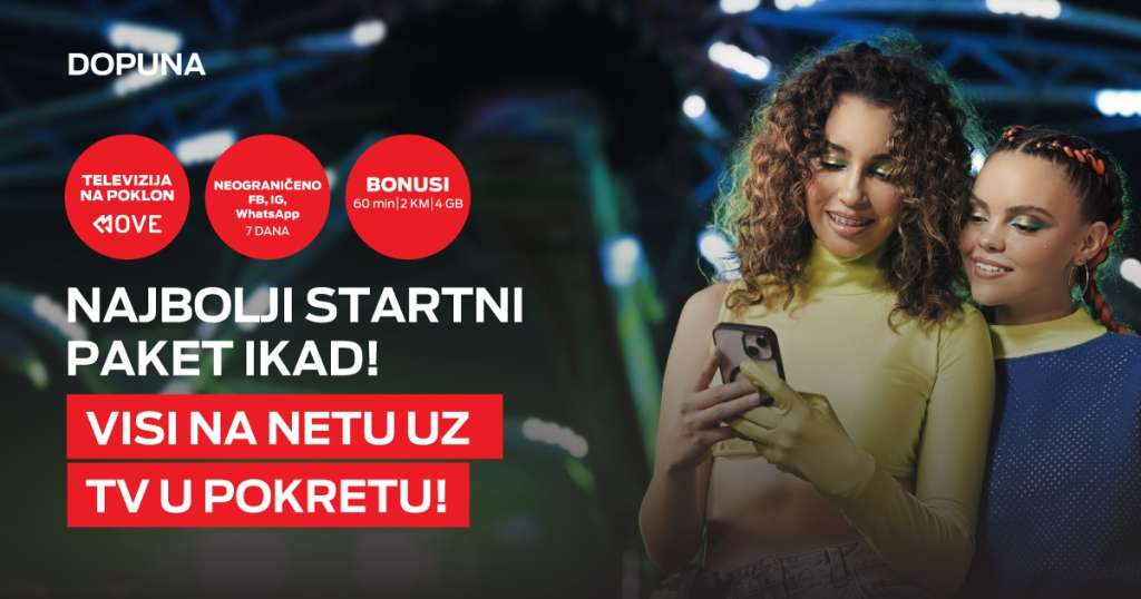 BANJA LUKA, 1. listopada (FENA) - Novi Dopuna: Start paket za samo 6 KM donosi ti jedinstvenu kombinaciju bonusa i digitalne zabave na svakom koraku. U paketu dobivaš pristup MOVE TV usluzi tri dana, 4GB mobilnog neta i 60 minuta razgovora u mreži m:tel-a i u roamingu u mrežama operatora regije Zapadnog Balkana (7 dana), 7 dana neograničenog pristupa društvenim mrežama Facebook, Instagram i WhatsApp.