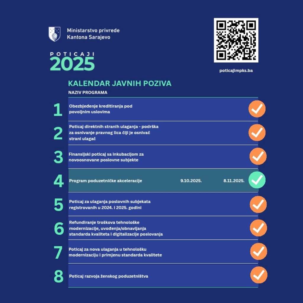 SARAJEVO, 14. oktobra (FENA) - Kanton Sarajevo je i u 2025. godini obezbijedio značajna sredstva za podršku privrednicima. I ove godine nastavljen je trend sve većeg interesovanja privrednika pa je na četiri javna poziva Ministarstva privrede Kantona Sarajevo zabilježen rekordan broj aplikacija, njih 822, a za ovu namjenu je izdvojeno 4,83 miliona KM.