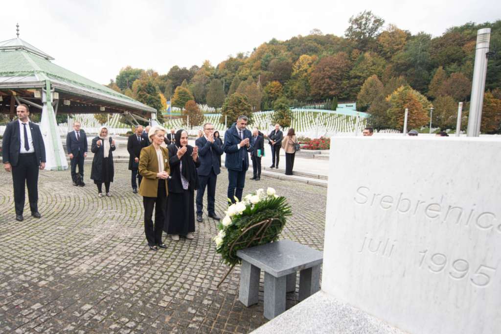 SREBRENICA, 14. oktobra (FENA) - Predsjednica Evropske komisije Ursula von der Leyen započela je danas svoju zvaničnu posjetu Bosni i Hercegovini obilaskom Memorijalnog centra Srebrenica.