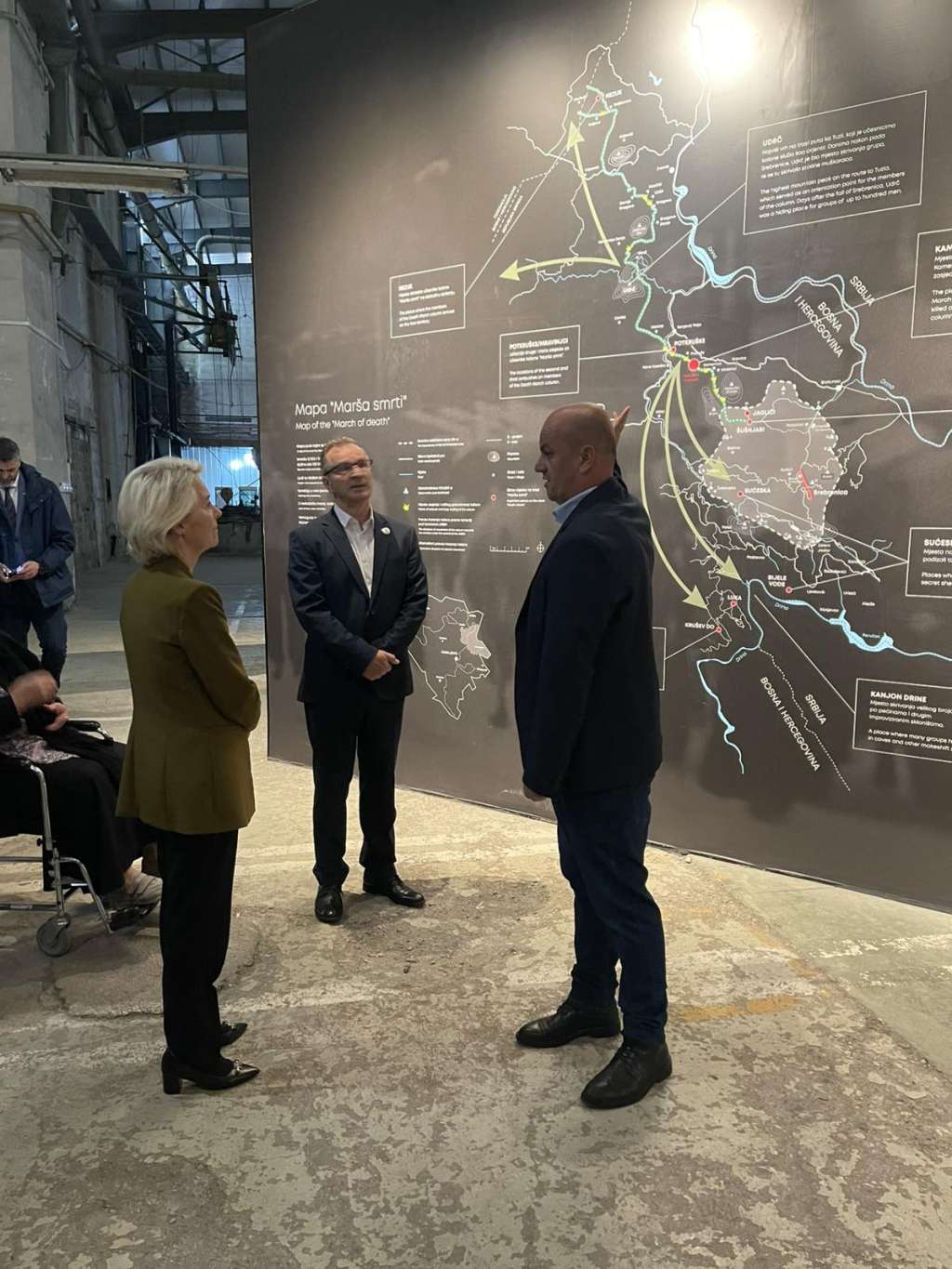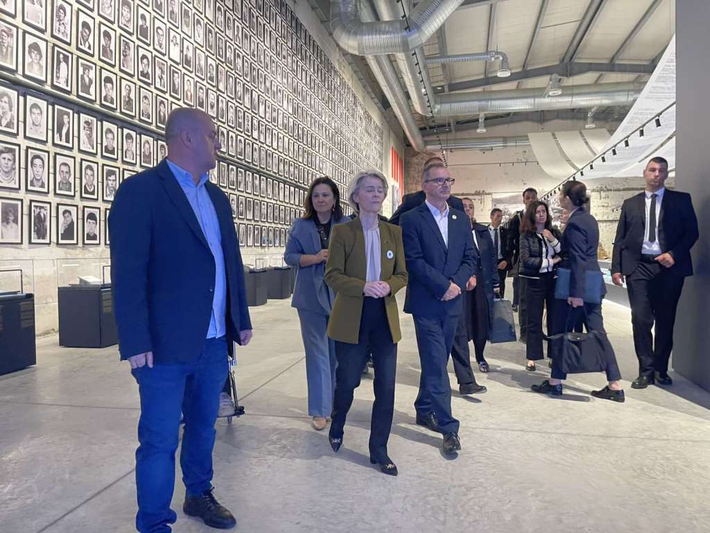 U pratnji Munire Subašić, predsjednice udruženja "Majke Srebrenice i Žepe", Emira Suljagića, direktora Memorijalnog centra, Luigija Sorece, šefa Delegacije EU u BiH, i Hamdije Fejzića, predsjednika Upravnog odbora Centra, Ursula von der Leyen odala je počast žrtvama genocida.