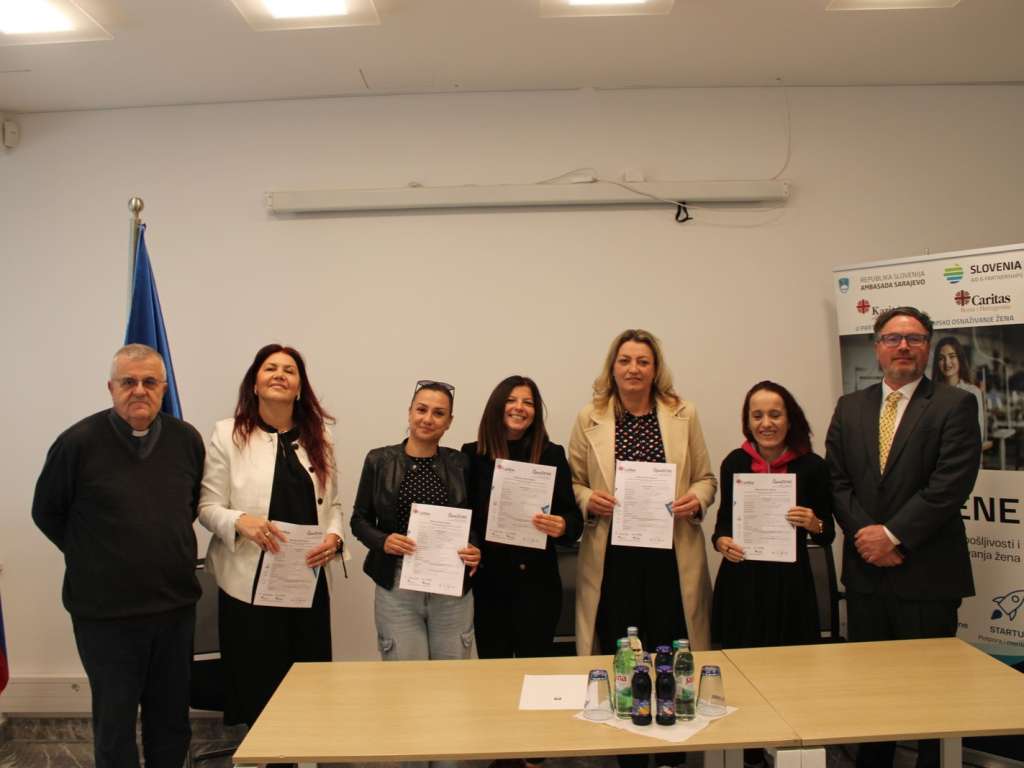 SARAJEVO, 20. listopada (FENA) - U prostorijama Veleposlanstva Republike Slovenije u Sarajevu u ponedjeljak je potpisano šest ugovora o dodjeli financijskih potpora za pokretanje ženskih poduzeća u okviru projekta OsnaŽENE – Ekonomska inkluzija i razvoj vještina za žene u BiH.