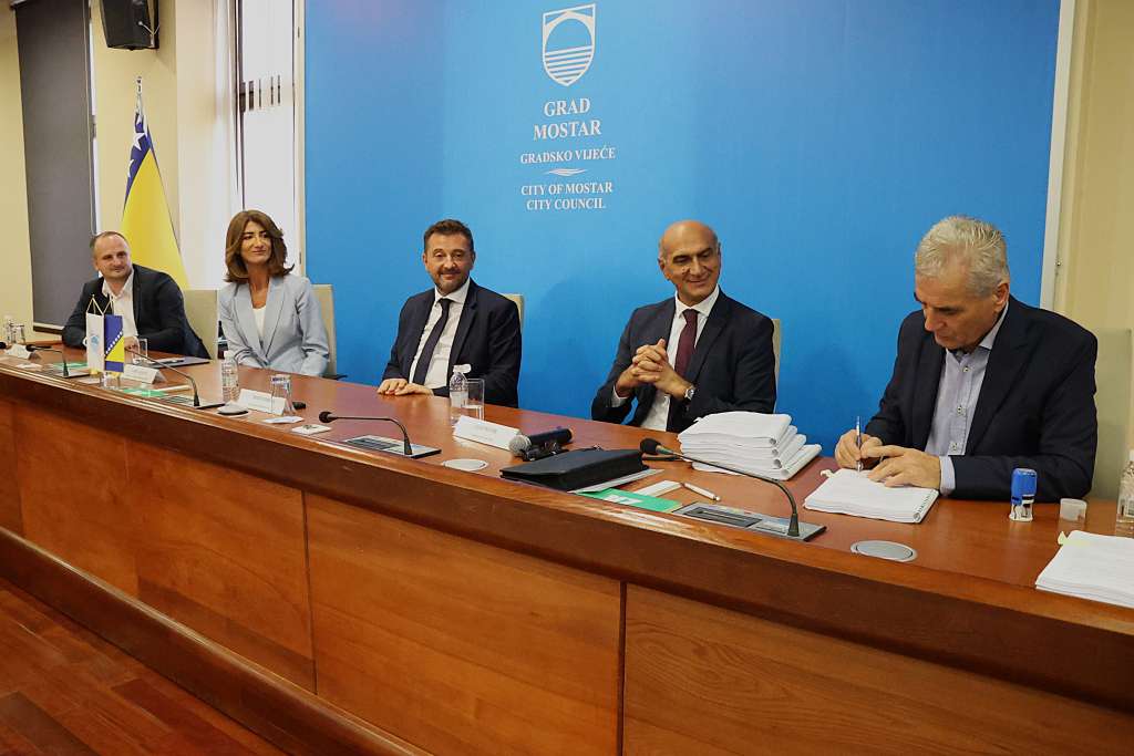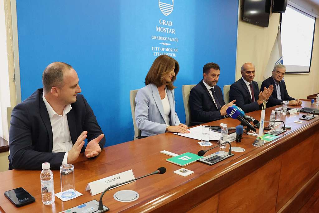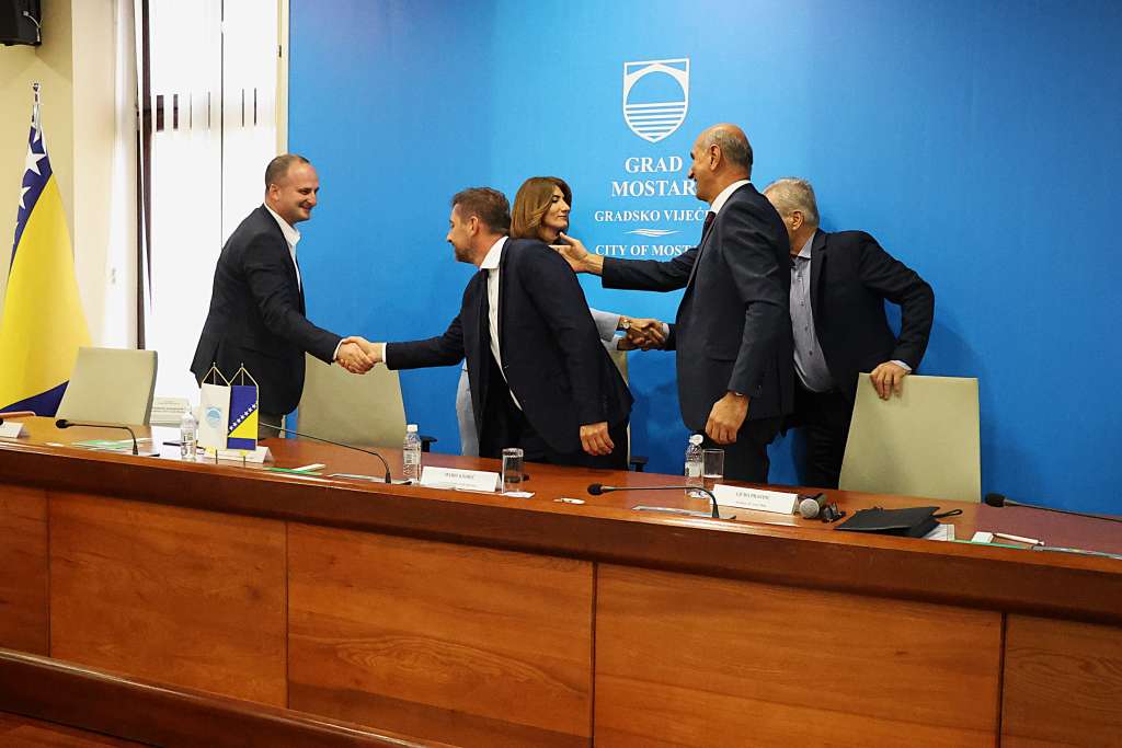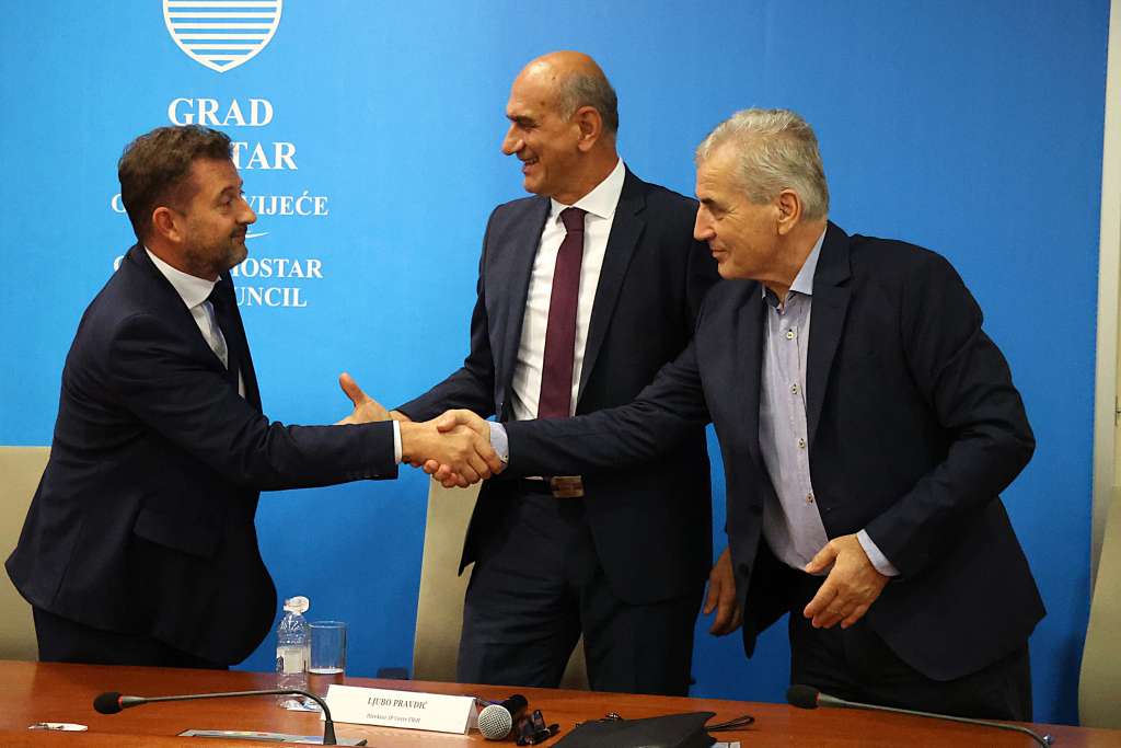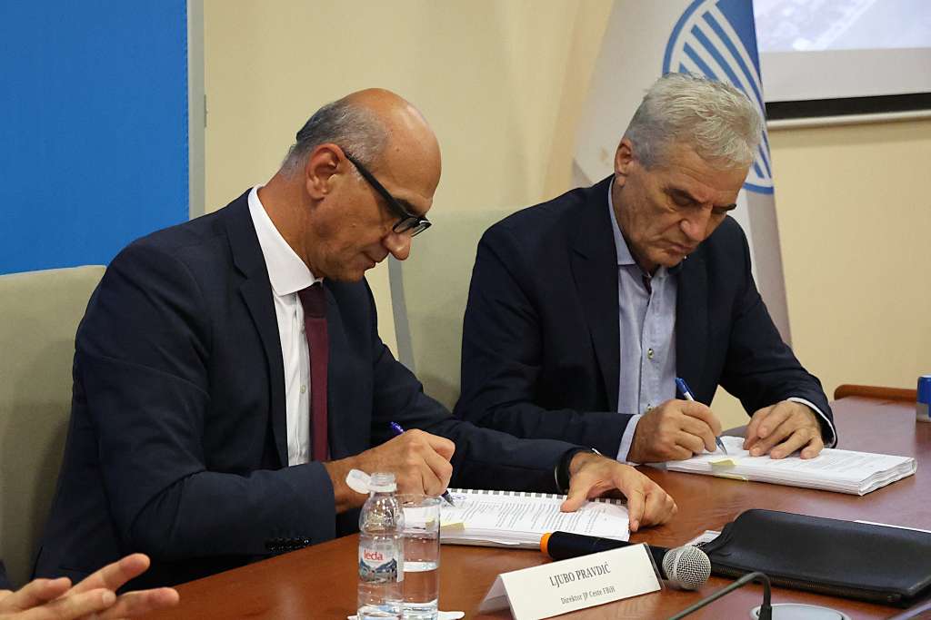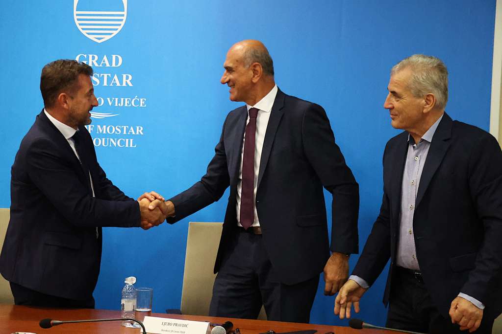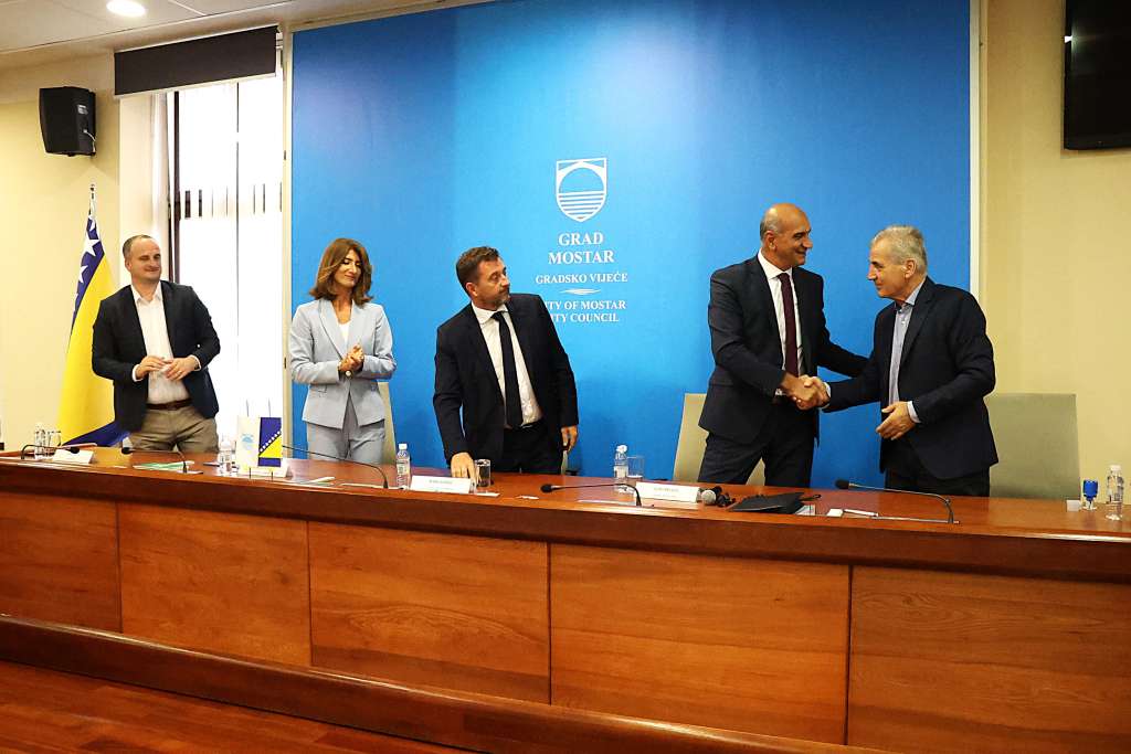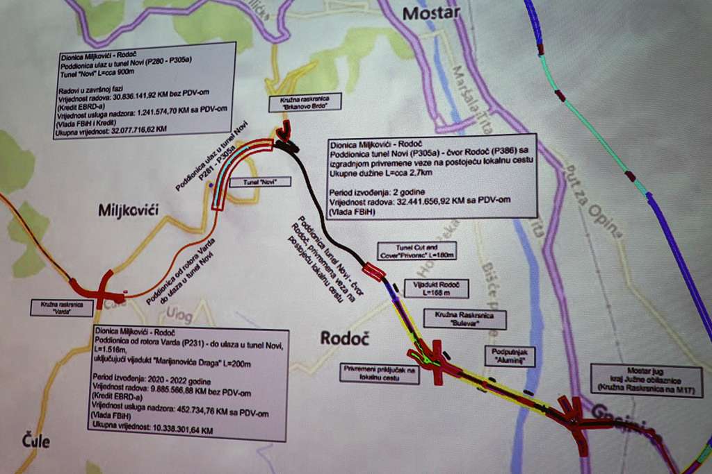 MOSTAR, 23. listopada (FENA) – U mostarskoj Gradskoj vijećnici u četvrtak je održano potpisivanje Ugovora za izvođenje radova na izgradnji Južne obilaznice Mostara, Miljkovići – Rodoč, veza na M17, poddionica tunel Novi (P305a) i čvor Rodoč (P386) sa izgradnjom privremene veze na postojeću lokalnu cestu. Riječ je o IV. fazi radova na ovoj dionici, a vrijednost ugovorenih radova je 32.441.656,92 KM, dok je vrijednost ugovora za nadzor 1.788.930 KM.