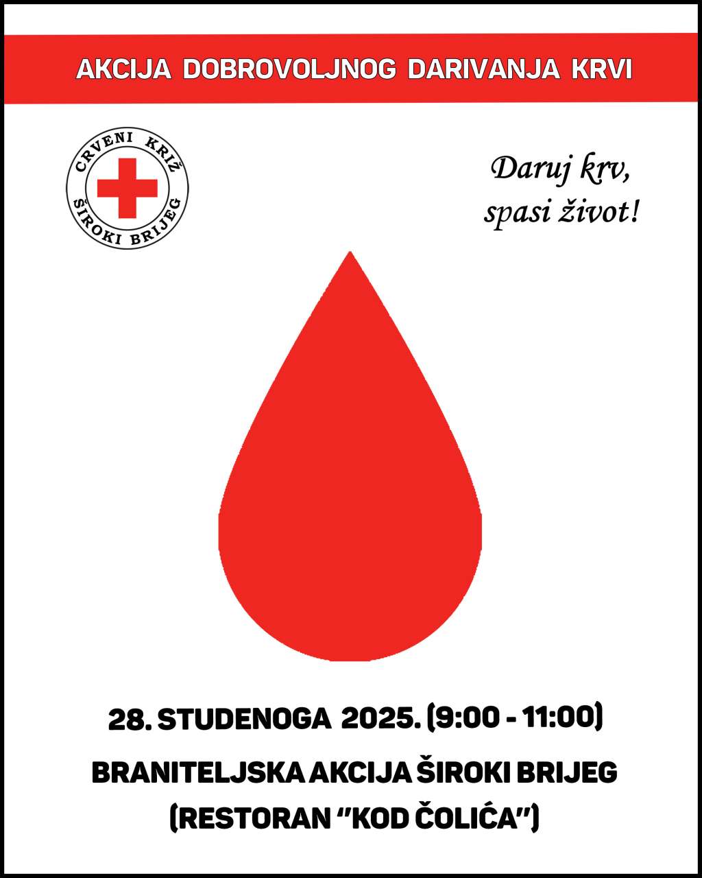 ŠIROKI BRIJEG, 27. studenoga (FENA) - Crveni križ Široki Brijeg organizira braniteljsku akciju darivanja krvi u suradnji s Odborom za branitelje Grada Širokog Brijega i Transfuzijskim centrom Sveučilišne kliničke bolnice Mostar.