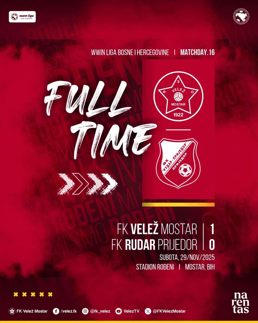 MOSTAR, 29. studenoga (FENA) - Nogometaši Veleža u Mostaru su u subotu u 16. kolu WWin lige BiH savladali Rudar 1:0.