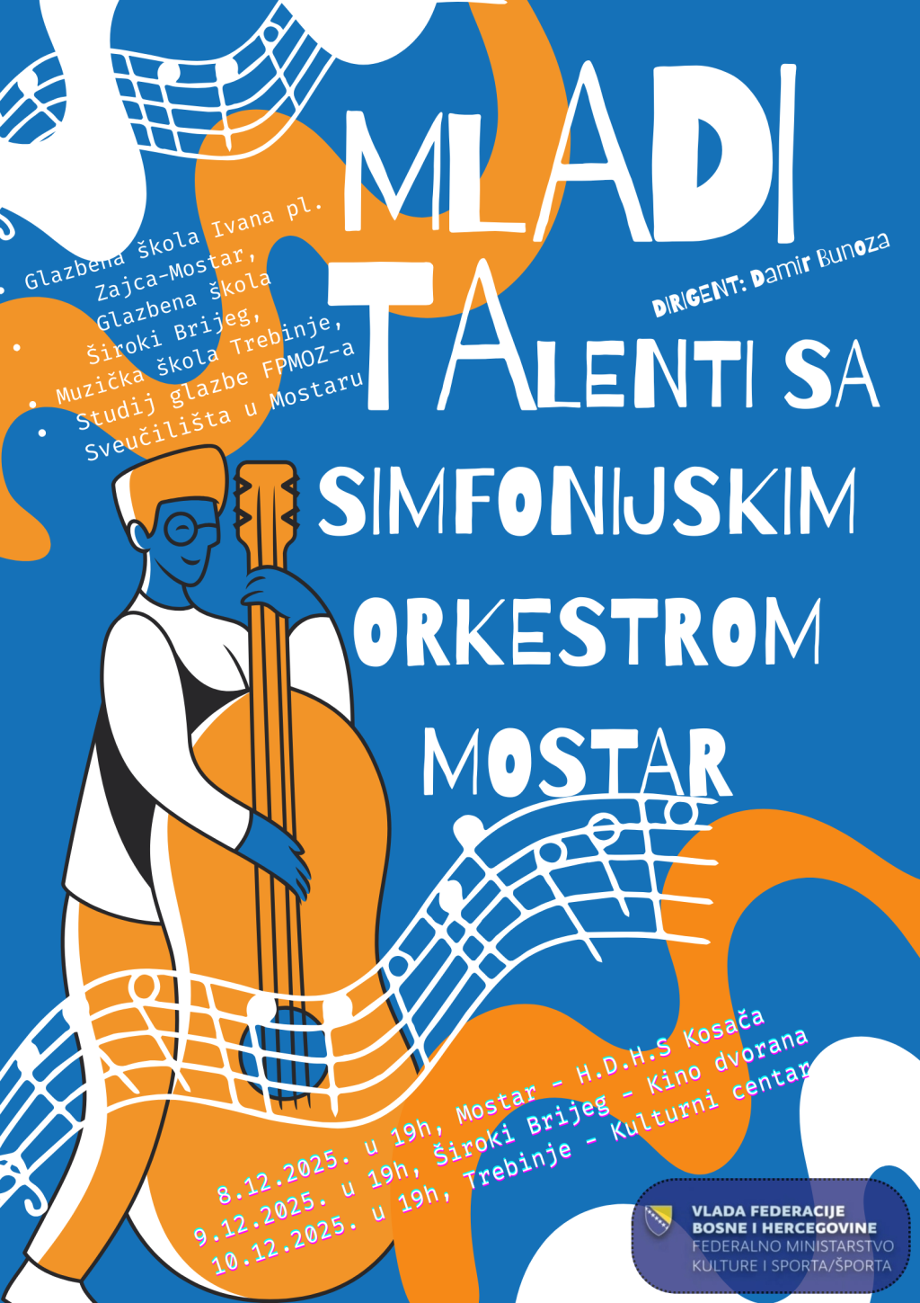 MOSTAR, 7. decembra (FENA) - "Mladi talenti sa Simfonijskim orkestrom Mostar" naziv je koncerta koji će biti održan 8. decembra u mostarskoj Kosači, a zatim 9. decembra u kino dvorani u Širokom Brijegu te 10. decembra u Kulturnom centru u Trebinju, s početkom u 19 sati.