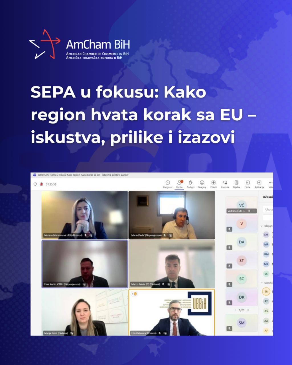 SARAJEVO, 12. decembra (FENA) - Američka trgovačka komora u Bosni i Hercegovini (AmCham BiH) organizovala je stručni webinar pod nazivom „SEPA u fokusu – Kako region hvata korak sa EU“, koji je okupio predstavnike ključnih institucija, bankarskog sektora i međunarodnih eksperata.