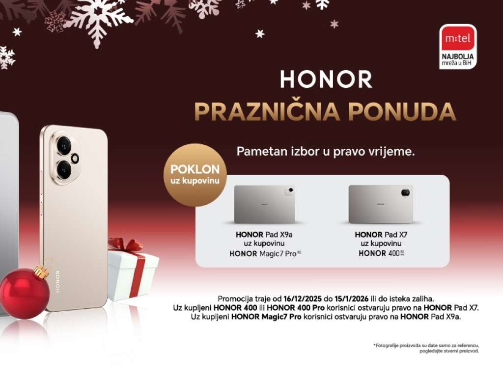 BANJA LUKA, 16. prosinca (FENA) - Stiže savršeno vrijeme za darivanje, u posebnoj m:tel ponudi izaberite HONOR telefone s poklonima koji oduševljavaju. Uz dizajn inspiriran svemirom, HONOR Magic7 Pro već na prvi pogled ostavlja utisak da impresivni izgled prate i vrhunske performanse.