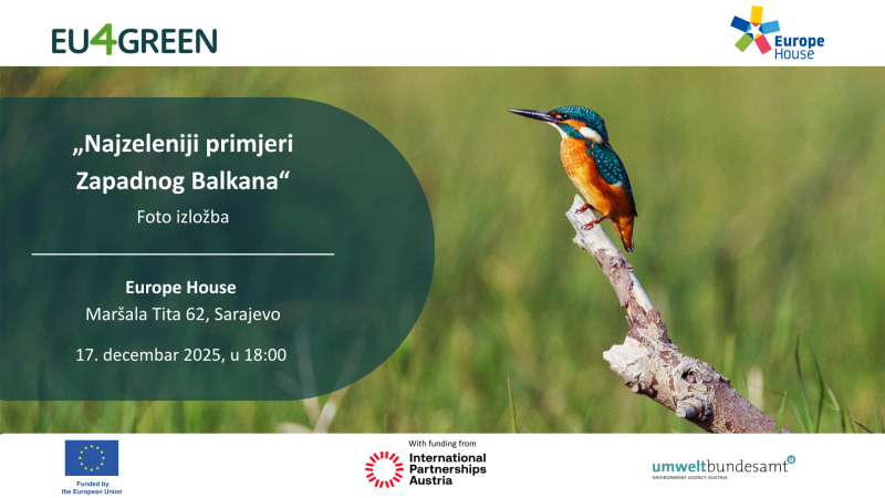 SARAJEVO, 17. decembra (FENA) - Izložba "Najzeleniji primjeri zapadnog Balkana", na kojoj će biti predstavljeni najbolji radovi sa EU4Green foto-konkursa, bit će otvorena danas u 18 sati u Europe House Sarajevo.