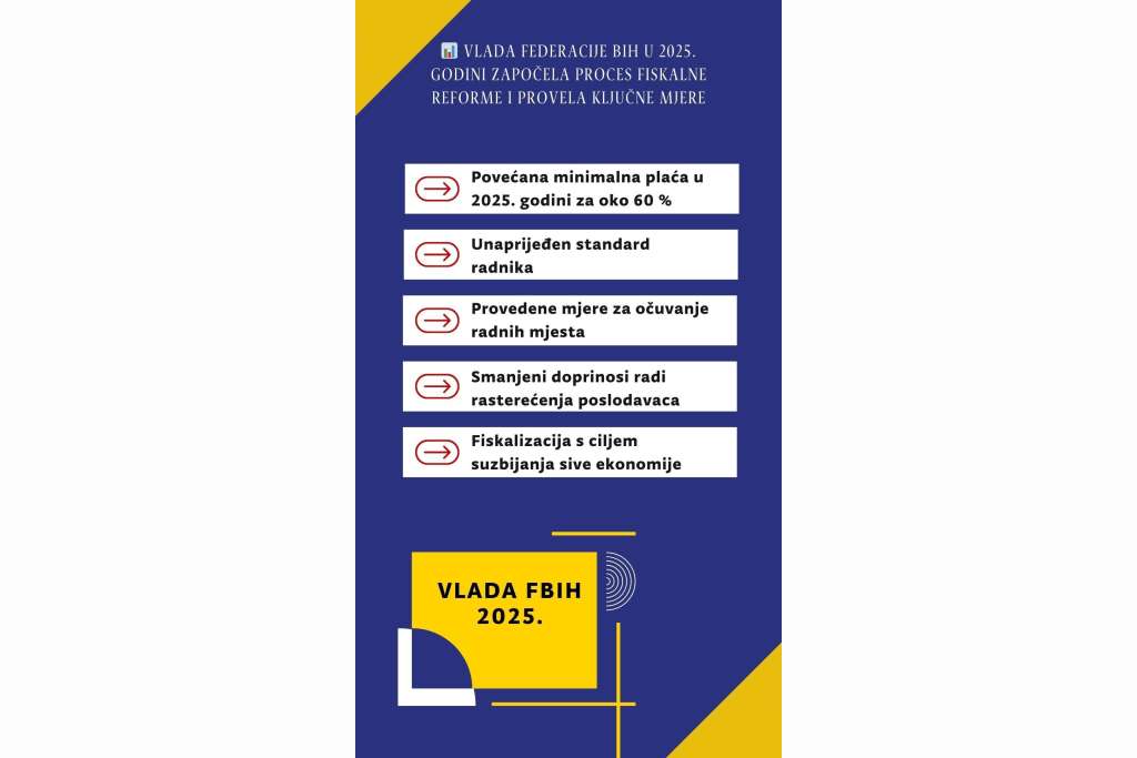 SARAJEVO, 26. decembra (FENA) - Vlada Federacije Bosne i Hercegovine u 2025. godini nastavila je provoditi sveobuhvatne mjere na jačanju ekonomskog i socijalnog položaja građana, unapređenju standarda radnika, očuvanju radnih mjesta, rasterećenju poslodavaca i suzbijanju sive ekonomije.
