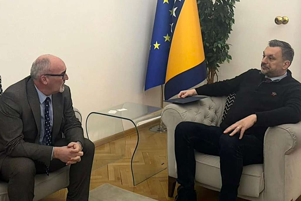 SARAJEVO, 8. januara (FENA) - Ministar vanjskih poslova Bosne i Hercegovine Elmedin Konaković sastao se danas sa ambasadorom Švicarske u BiH Gabrieleom Derighettijem. Konaković je poželio dobrodošlicu ambasadoru Derighettiju i uputio mu čestitke povodom preuzimanja predsjedavanja OSCE-om, naglašavajući da povratak Švicarske na čelo Organizacije potvrđuje njenu dugogodišnju i vjerodostojnu posvećenost miru, sigurnosti i stabilnosti.
