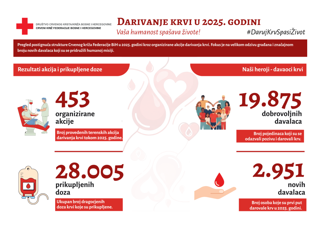 SARAJEVO, 30. januara (FENA) - Crveni križ Federacije Bosne i Hercegovine ostvario je u 2025. godini izuzetne rezultate u oblasti darivanja krvi. Tokom protekle godine organizirane su ukupno 453 akcije darivanja krvi, širom Federacije BiH. U okviru tih akcija prikupljeno je 28.005 doza krvi, što je značajan porast u odnosu na 2024. godinu, kad je prikupljeno 21.100 doza.