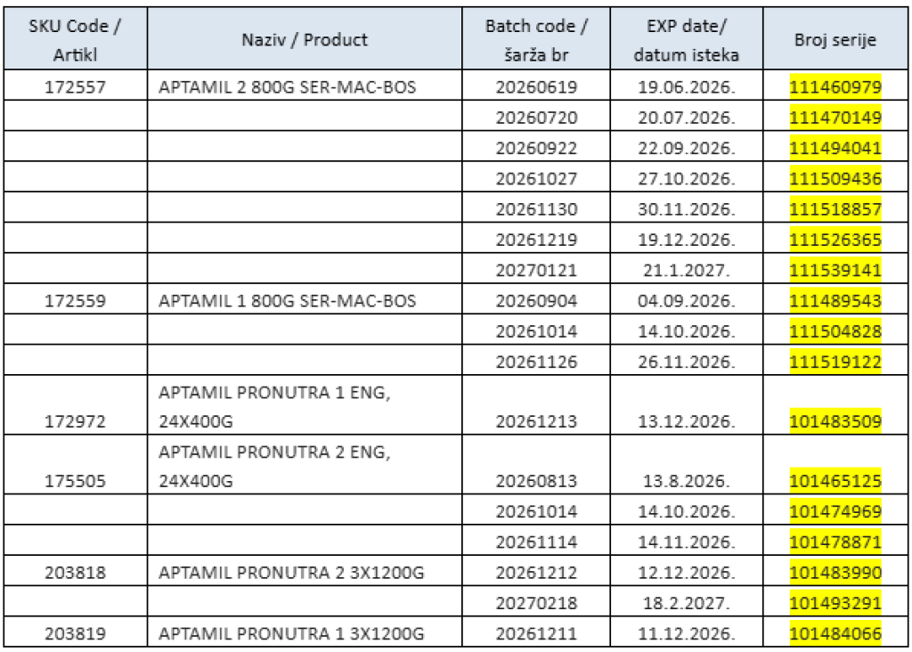 MOSTAR, February 10 (FENA) – The Food Safety Agency of Bosnia and Herzegovina has been notified, through the Rapid Alert System for Food and Feed (EU RASFF), that certain batches of "Aptamil" infant formula distributed on the Bosnian market contain cereulide at levels that may pose a risk to consumers.