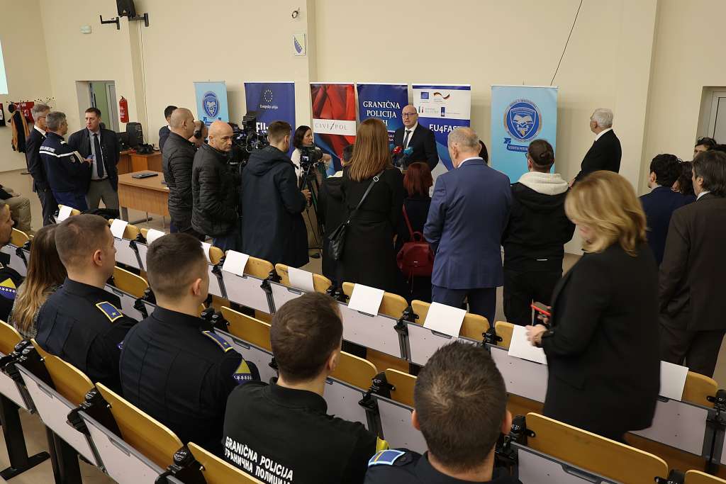 MOSTAR, 12. veljače (FENA) - Ceremonija primopredaje specijalizirane opreme za obuku pilota dronova Graničnoj policiji Bosne i Hercegovine (GPBiH) održana je u četvrtak u prostorijama Agencije za školovanje i stručno usavršavanje kadrova (AEPTM) u Mostaru, gdje policijski službenici trenutno prolaze temeljnu obuku za operatere dronova u okviru ove agencije.